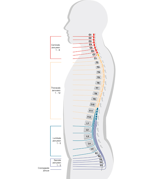 Uw bewegings- of functieverlies hangt af van de plaats van het letsel in uw ruggenmerg. Het ruggenmerg heeft vier gebieden met zenuwen: het cervicale, thoracale, lumbale en sacrale gebied: